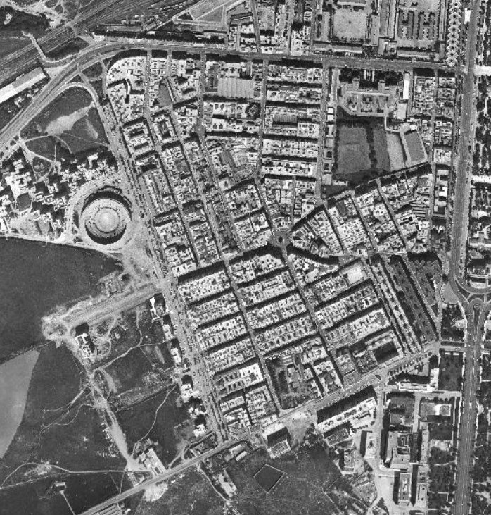 Hace algunos años llego a mis manos un extracto de la propuesta para uno de los primeros barrios de expansion de la ciudad. En efecto era algo similar a lo que podria entenderse como ciudad jardin, en lo que se intercalaban las edificiaciones con las zonas verdes. Esto simplemente quedo en un papel y en cambio se opto por un modelo que colmatara por medio de edificaciones alineadas a vial toda la superficie disponible, la tipología es la de pequeños edificios plurifamiliares que colmatan su parcela y en su interior poseen pequeños patios que apenas justificaban las condiciones higiénicas de la época (existen algunas piezas con patios interiores de parcela mayores sobre todo en la zona norte del barrio).